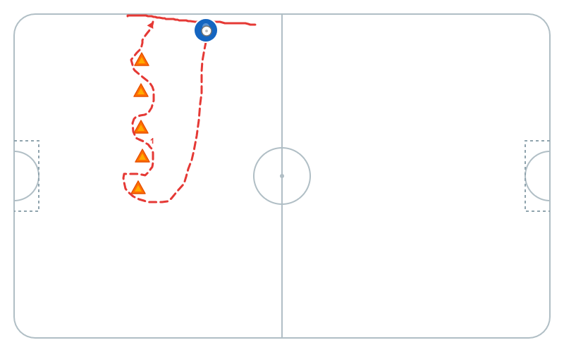 Bei den ersten Hütchen führt man den Ball nur um die Hütchen herum, beim zweiten Mal mit dem Körper, und danach schießt man aufs Tor (mit oder ohne Goalie).