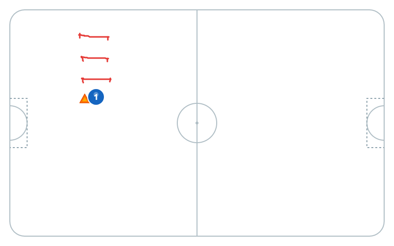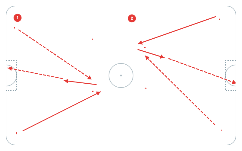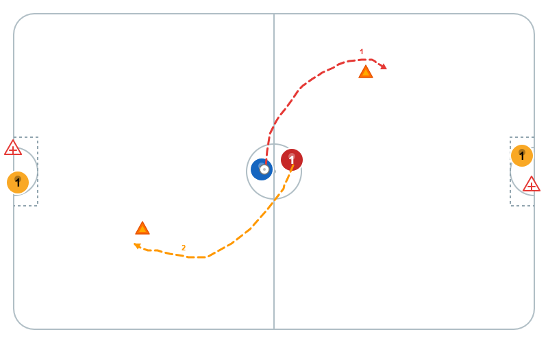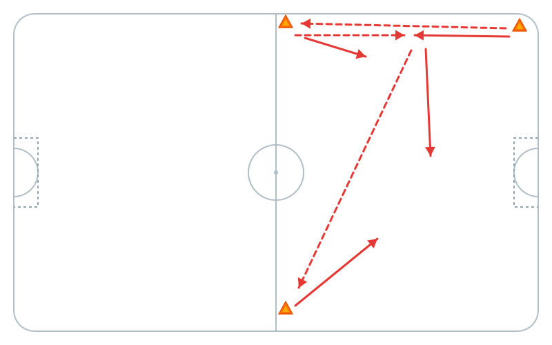 Man spielt aus der Ecke einen Doppelpass mit dem Spieler an der Mittellinie und spielt den Ball anschließend zum anderen Hütchen an der Mittellinie. Nun wird ein 2-gegen-1 gespielt.