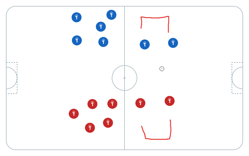 Man spielt in der Mitte ein 2 vs. 2, mit drei Anspiel Stationen außen. Wenn man mit diesen passt Wechselt man anschließend mit diesen. Wenn der Ball rausfliegt oder im Tor landet wird das Spiel vom Goalie wieder begonnen. Das Passen ist Relevanter als das Schießen, bei dieser Übung eher außen rum spielen.